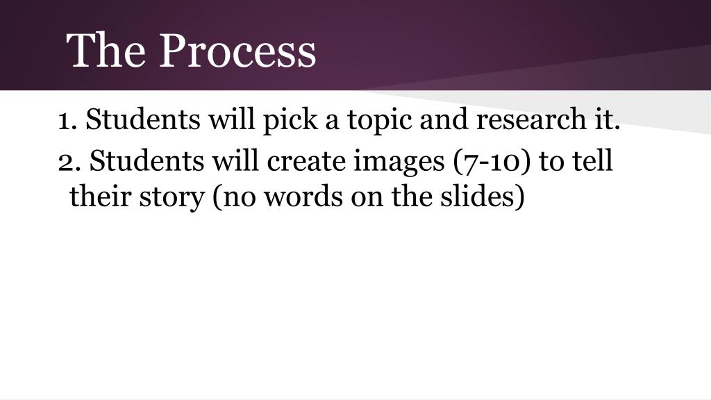 The Process 1. Students will pick a topic and research it. 2. Students will create images (7-10) to tell their story (no words on the slides)
