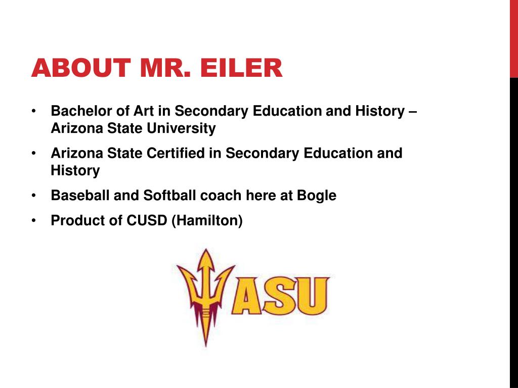 About Mr. Eiler • Bachelor of Art in Secondary Education and History – Arizona State University • Arizona State Certified in Secondary Education and History • Baseball and Softball coach here at Bogle • Product of CUSD (Hamilton)