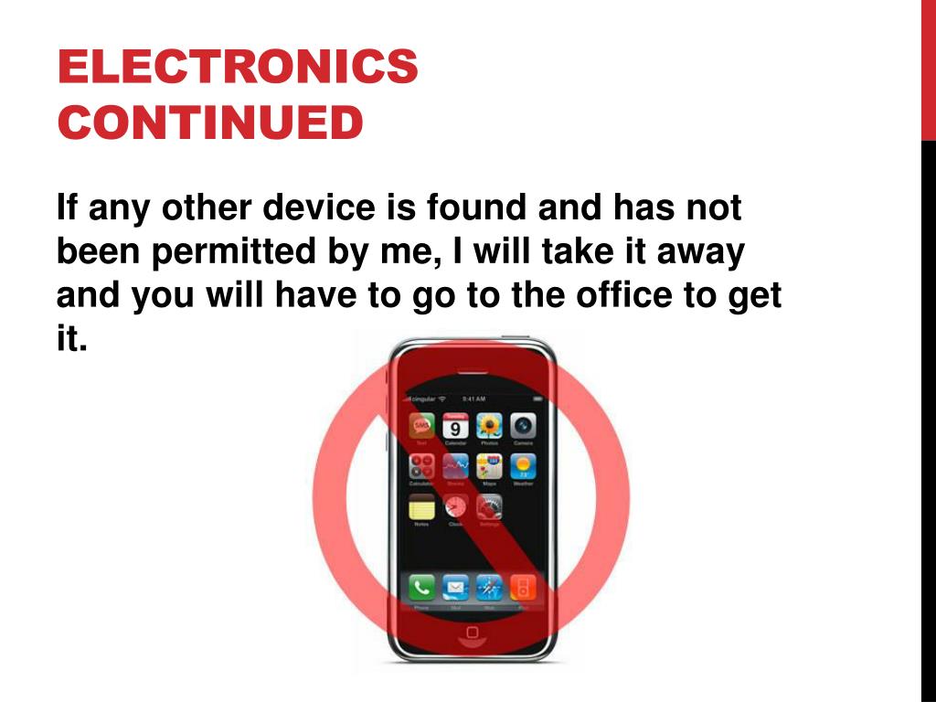 Electronics Continued • If any other device is found and has not been permitted by me, I will take it away and you will have to go to the office to get it.