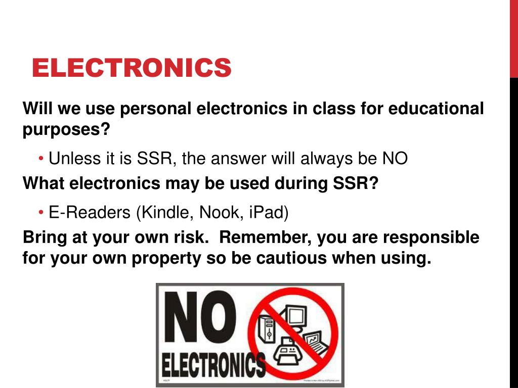 Electronics • Will we use personal electronics in class for educational purposes? • Unless it is SSR, the answer will always be NO • What electronics may be used during SSR? • E-Readers (Kindle, Nook, iPad) • Bring at your own risk. Remember, you are responsible for your own property so be cautious when using.