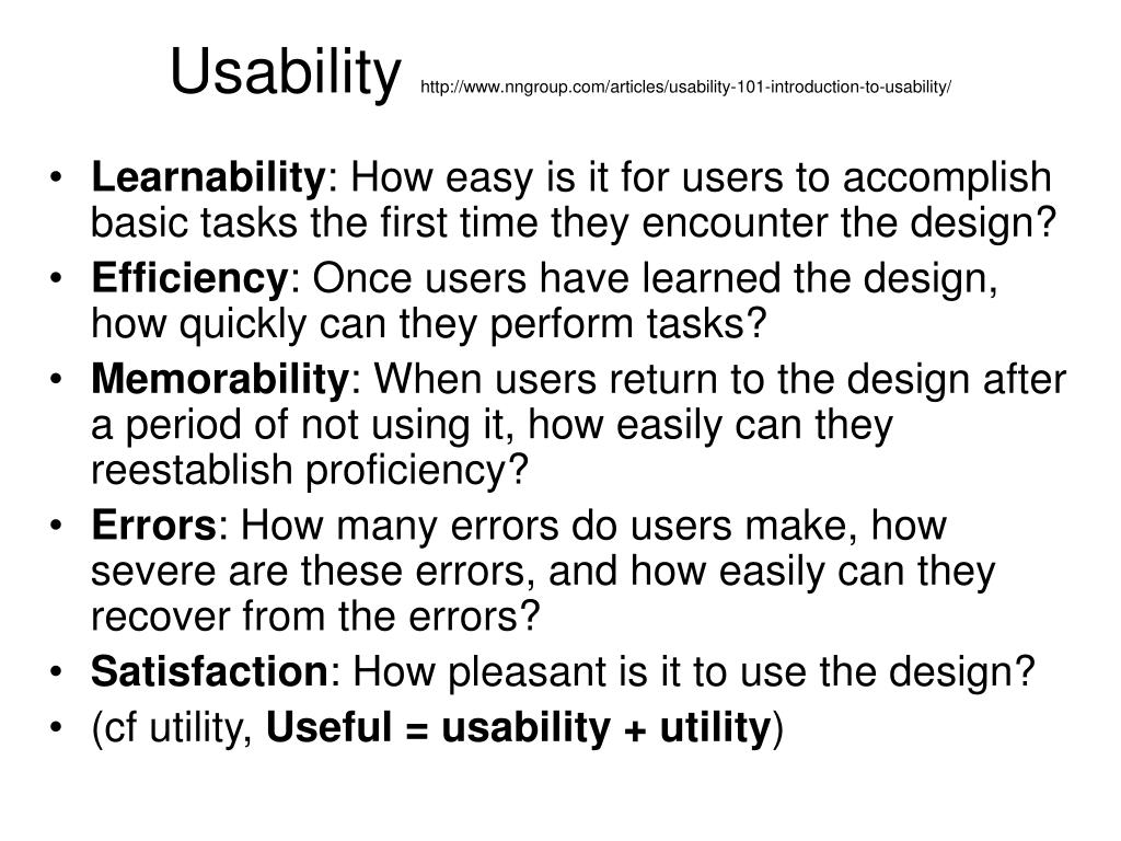 Usability http://www.nngroup.com/articles/usability-101-introduction-to-usability/ Learnability: How easy is it for users to accomplish basic tasks the first time they encounter the design? Efficiency: Once users have learned the design, how quickly can they perform tasks? Memorability: When users return to the design after a period of not using it, how easily can they reestablish proficiency? Errors: How many errors do users make, how severe are these errors, and how easily can they recover from the errors? Satisfaction: How pleasant is it to use the design? (cf utility, Useful = usability + utility)