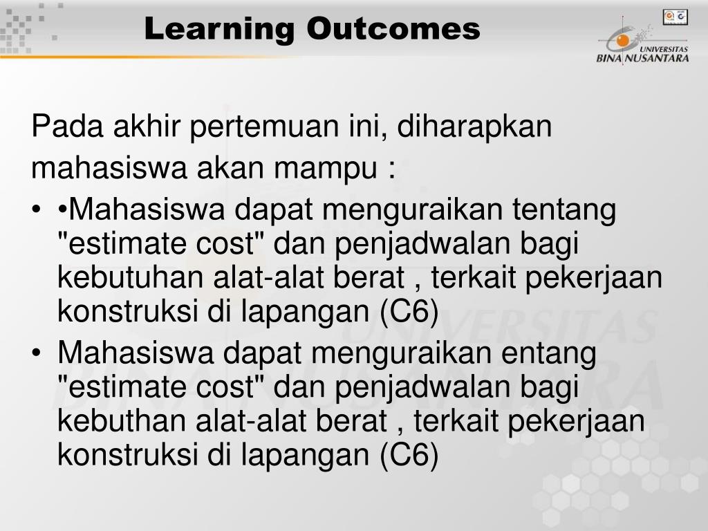 Learning Outcomes Pada akhir pertemuan ini, diharapkan mahasiswa akan mampu : • •Mahasiswa dapat menguraikan tentang "estimate cost" dan penjadwalan bagi kebutuhan alat-alat berat , terkait pekerjaan konstruksi di lapangan (C6) • Mahasiswa dapat menguraikan entang "estimate cost" dan penjadwalan bagi kebuthan alat-alat berat , terkait pekerjaan konstruksi di lapangan (C6)