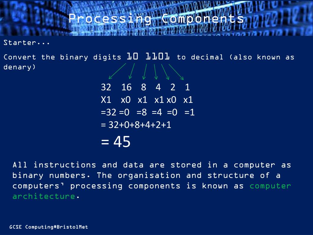 Session Objectives #3. Processing Components. Starter... Convert the binary digits 10 1101 to decimal (also known as denary). 16 8 4 2 1 X1 x0 x1 x1 x0 x1 =32 =0 =8 =4 =0 =1 = 32+0+8+4+2+1 = 45.