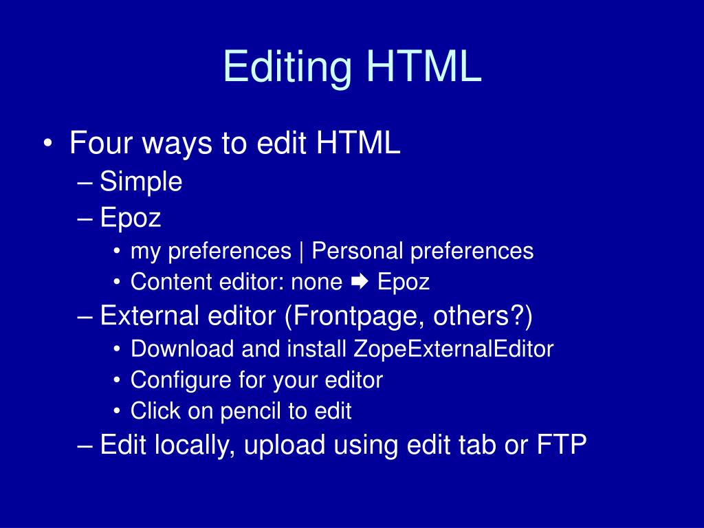 Editing HTML • Four ways to edit HTML • Simple • Epoz • my preferences | Personal preferences • Content editor: none Epoz • External editor (Frontpage, others?) • Download and install ZopeExternalEditor • Configure for your editor • Click on pencil to edit • Edit locally, upload using edit tab or FTP