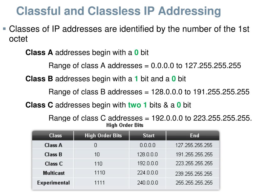 Classful and Classless IP Addressing • Classes of IP addresses are identified by the number of the 1st octet Class A addresses begin with a 0 bit Range of class A addresses = 0.0.0.0 to 127.255.255.255 Class B addresses begin with a 1 bit and a 0 bit Range of class B addresses = 128.0.0.0 to 191.255.255.255 Class C addresses begin with two 1 bits & a 0 bit Range of class C addresses = 192.0.0.0 to 223.255.255.255.