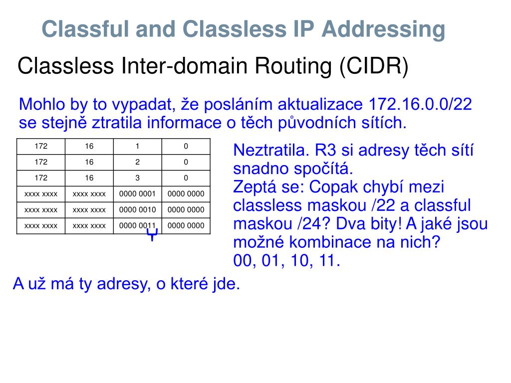 Classful and Classless IP Addressing Mohlo by to vypadat, že posláním aktualizace 172.16.0.0/22 se stejně ztratila informace o těch původních sítích. Classless Inter-domain Routing (CIDR) Neztratila. R3 si adresy těch sítí snadno spočítá. Zeptá se: Copak chybí mezi classless maskou /22 a classful maskou /24? Dva bity! A jaké jsou možné kombinace na nich? 00, 01, 10, 11. A už má ty adresy, o které jde.