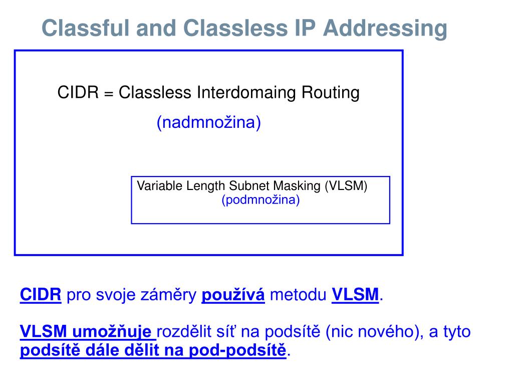 Classful and Classless IP Addressing CIDR = Classless Interdomaing Routing (nadmnožina) Variable Length Subnet Masking (VLSM) (podmnožina) CIDR pro svoje záměry používá metodu VLSM. VLSM umožňuje rozdělit síť na podsítě (nic nového), a tyto podsítě dále dělit na pod-podsítě.