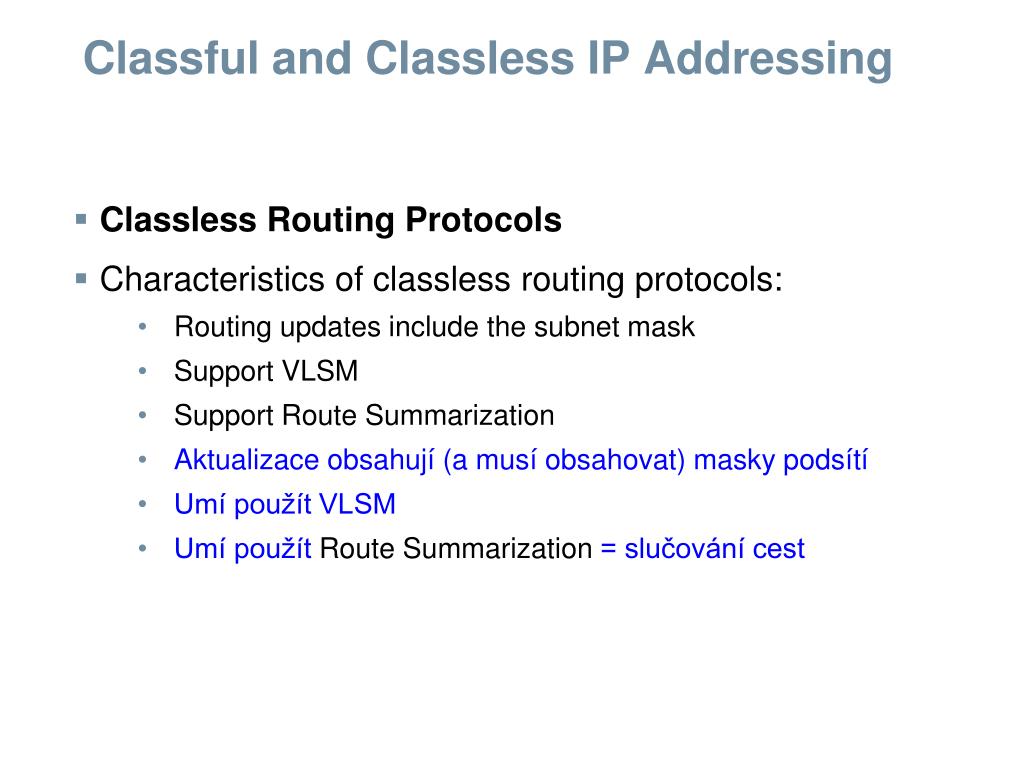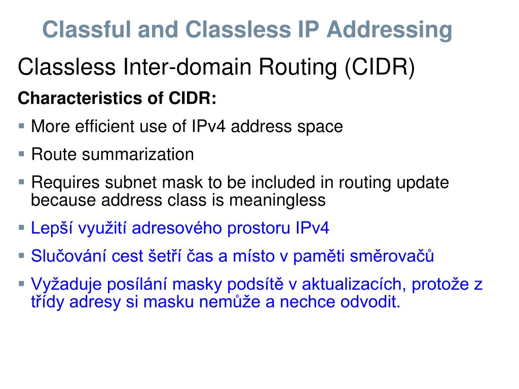 Classful and Classless IP Addressing Classless Inter-domain Routing (CIDR) Characteristics of CIDR: • More efficient use of IPv4 addressspace • Route summarization • Requires subnet mask to be included in routing updatebecause address class is meaningless • Lepší využití adresového prostoru IPv4 • Slučování cest šetří čas a místo v paměti směrovačů • Vyžaduje posílání masky podsítě v aktualizacích, protože z třídy adresy si masku nemůže a nechce odvodit.