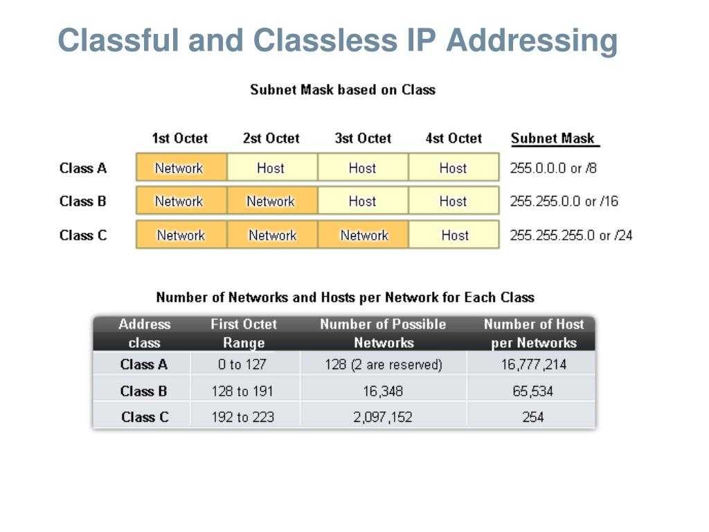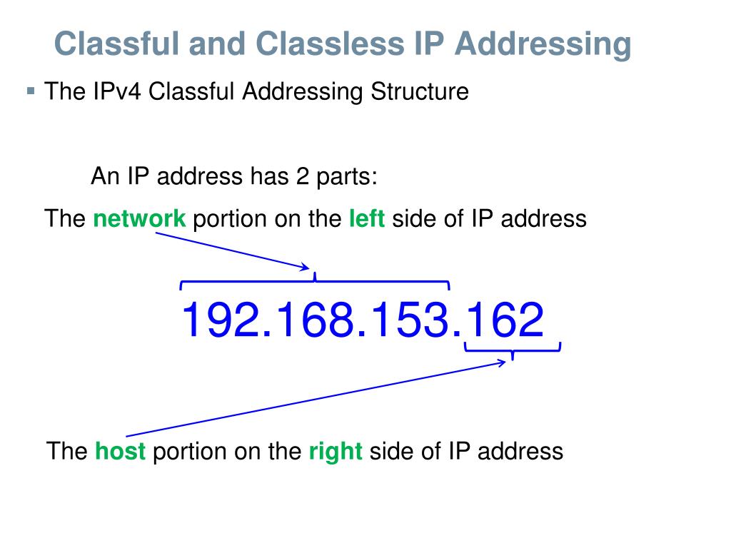 Classful and Classless IP Addressing • The IPv4 Classful Addressing Structure An IP address has 2 parts: The networkportionon the leftside of IP address 192.168.153.162 The hostportion on the right side of IP address