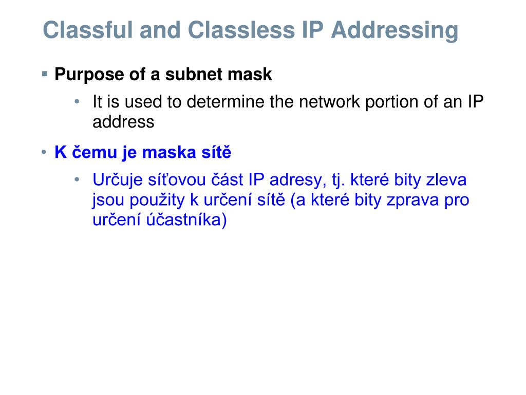 Classful and Classless IP Addressing • Purpose of a subnet mask • It is used to determine the network portion of an IP address • K čemu je maska sítě • Určuje síťovou část IP adresy, tj. které bity zleva jsou použity k určení sítě (a které bity zprava pro určení účastníka)