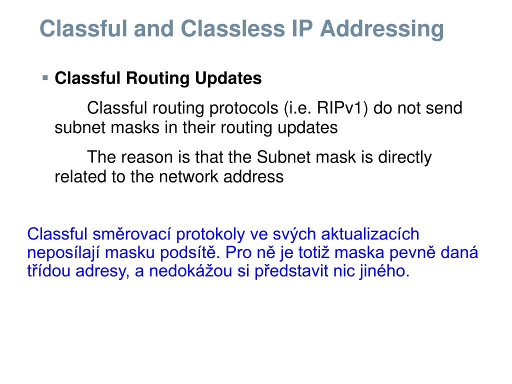 Classful and Classless IP Addressing • Classful Routing Updates Classful routing protocols (i.e. RIPv1)do not send subnet masks in their routing updates The reason is that the Subnet mask isdirectly related to the network address Classful směrovací protokoly ve svých aktualizacích neposílají masku podsítě. Pro ně je totiž maska pevně daná třídou adresy, a nedokážou si představit nic jiného.