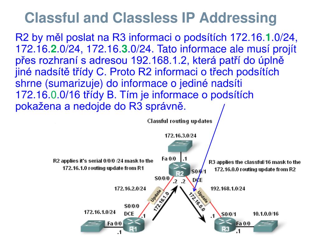 Classful and Classless IP Addressing R2 by měl poslat na R3 informaci o podsítích 172.16.1.0/24, 172.16.2.0/24, 172.16.3.0/24. Tato informace ale musí projít přes rozhraní s adresou 192.168.1.2, která patří do úplně jiné nadsítě třídy C. Proto R2 informaci o třech podsítích shrne (sumarizuje) do informace o jediné nadsíti 172.16.0.0/16 třídy B. Tím je informace o podsítích pokažena a nedojde do R3 správně.