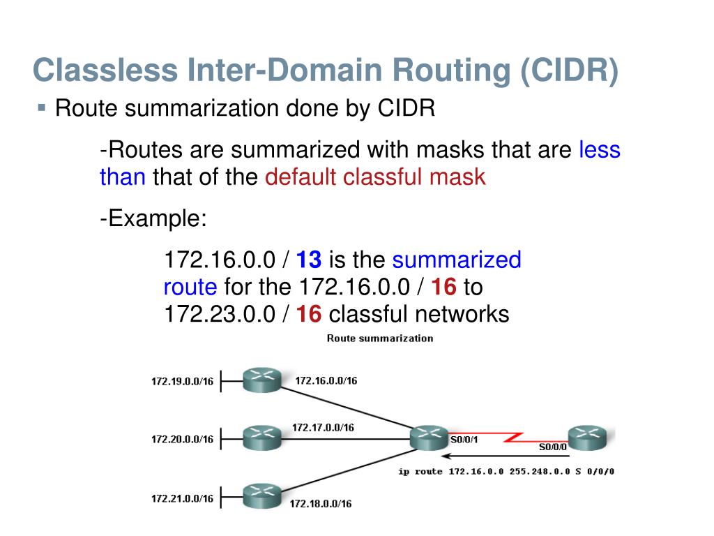 Classless Inter-Domain Routing (CIDR) • Route summarization done by CIDR -Routes are summarized with masks that are less than that of the default classful mask -Example: 172.16.0.0 / 13is the summarized route for the 172.16.0.0 / 16 to 172.23.0.0 / 16 classful networks