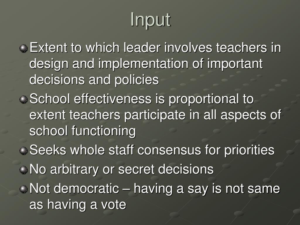 Input Extent to which leader involves teachers in design and implementation of important decisions and policies School effectiveness is proportional to extent teachers participate in all aspects of school functioning Seeks whole staff consensus for priorities No arbitrary or secret decisions Not democratic – having a say is not same as having a vote