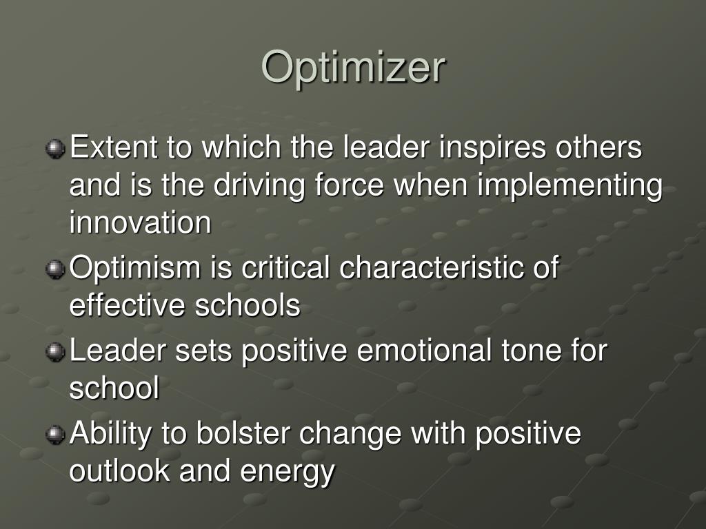Optimizer Extent to which the leader inspires others and is the driving force when implementing innovation Optimism is critical characteristic of effective schools Leader sets positive emotional tone for school Ability to bolster change with positive outlook and energy