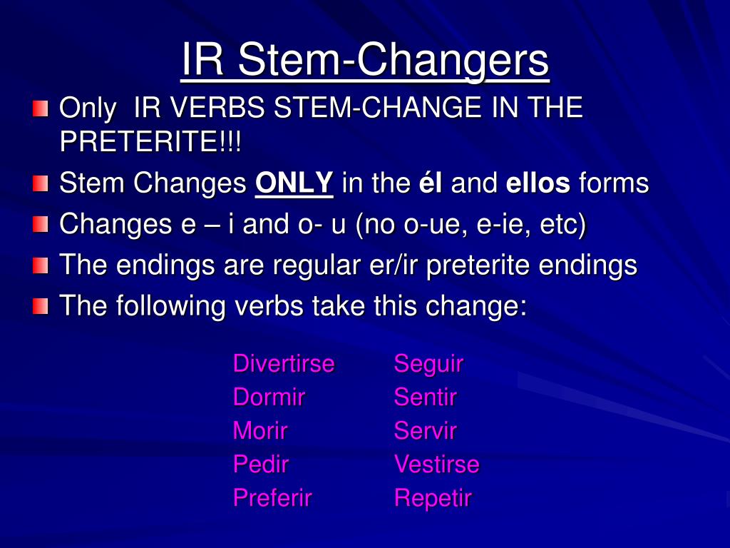 IR Stem-Changers • Only IR VERBS STEM-CHANGE IN THE PRETERITE!!! • Stem Changes ONLY in the él and ellos forms • Changes e – i and o- u (no o-ue, e-ie, etc) • The endings are regular er/ir preterite endings • The following verbs take this change: