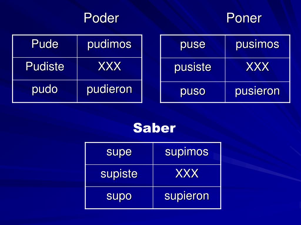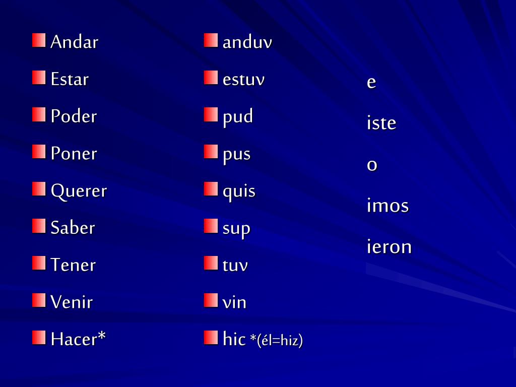 anduv estuv pud pus quis sup tuv vin hic *(él=hiz) e iste o imos ieron • Andar • Estar • Poder • Poner • Querer • Saber • Tener • Venir • Hacer*