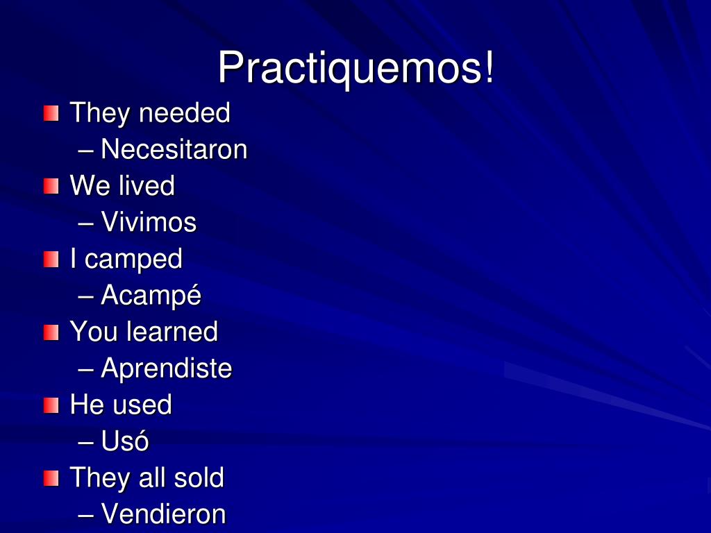 Practica • I played. • They ate. • They talked. • She danced. • You started. • I drank.