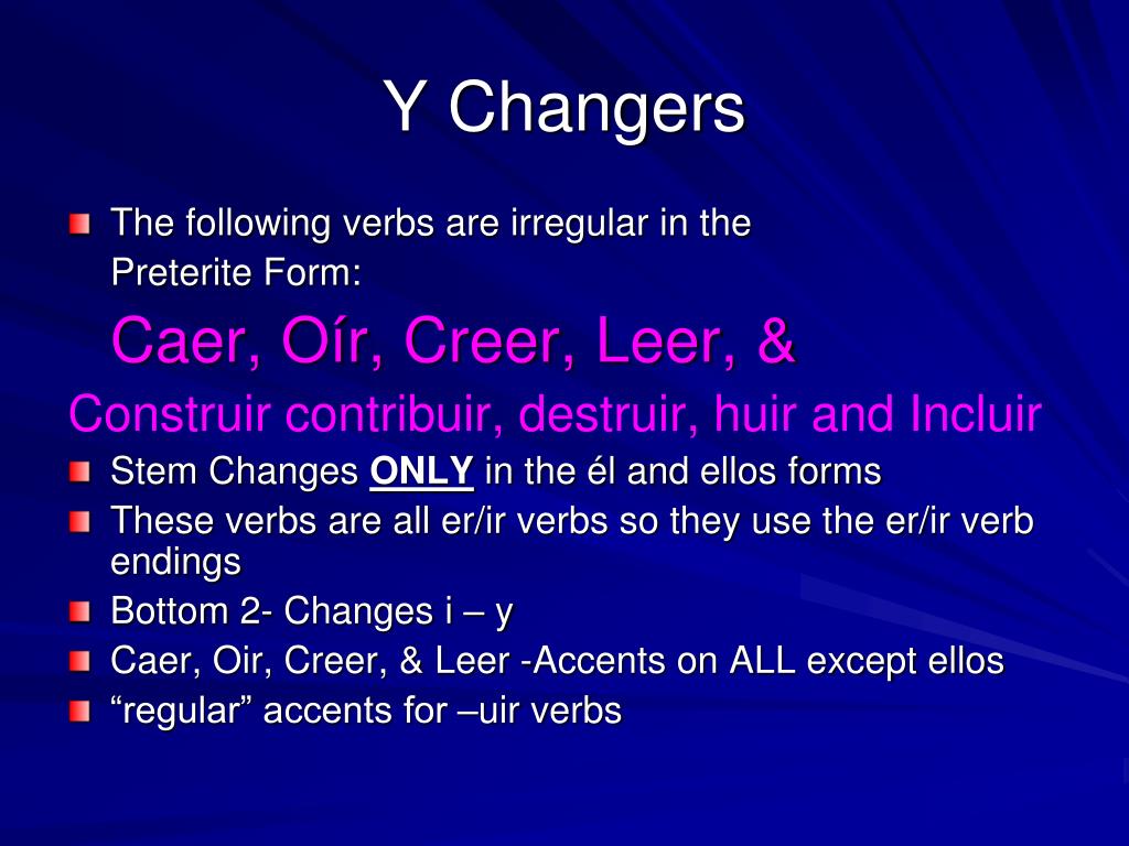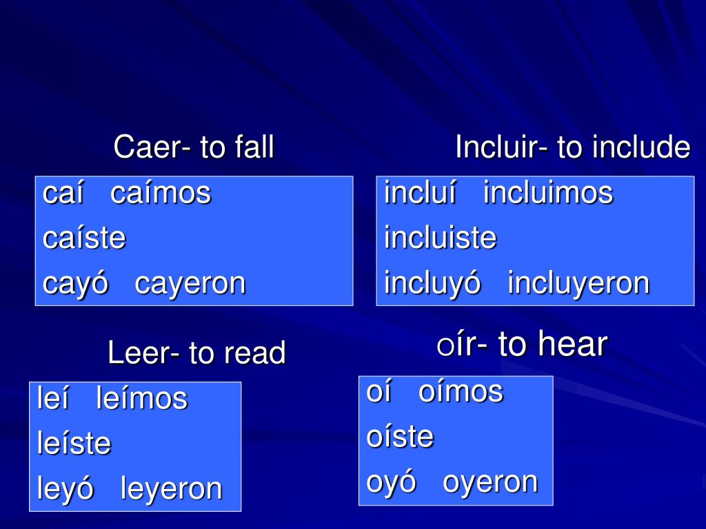 Caer- to fall caícaímos caíste cayócayeron Incluir- to include incluíincluimos incluiste incluyóincluyeron Oír- to hear oíoímos oíste oyóoyeron Leer- to read leíleímos leíste leyóleyeron