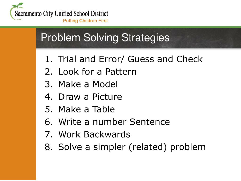 Problem Solving Strategies • Trial and Error/ Guess and Check • Look for a Pattern • Make a Model • Draw a Picture • Make a Table • Write a number Sentence • Work Backwards • Solve a simpler (related) problem