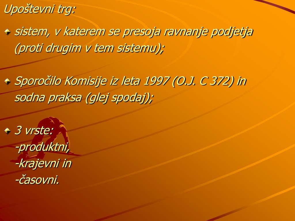 Upoštevni trg: • sistem, v katerem se presoja ravnanje podjetja (proti drugim v tem sistemu); • Sporočilo Komisije iz leta 1997 (O.J. C 372) in sodna praksa (glej spodaj); • 3 vrste: -produktni, -krajevni in -časovni.