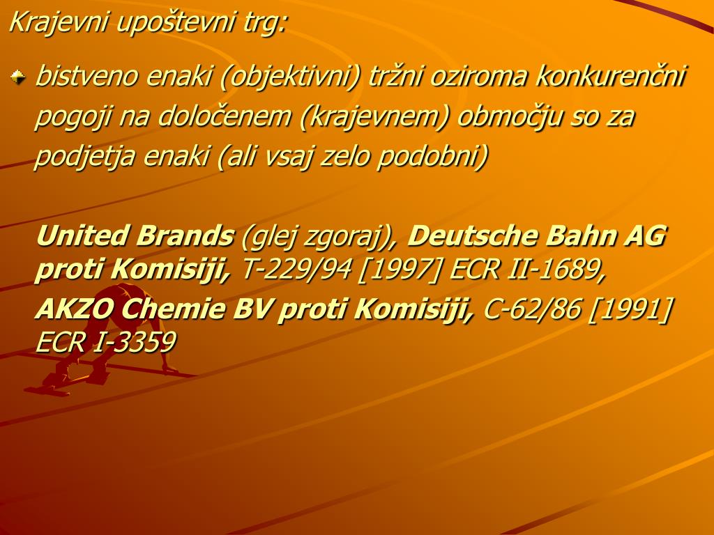 Krajevni upoštevni trg: • bistveno enaki (objektivni) tržni oziroma konkurenčni pogoji na določenem (krajevnem) območju so za podjetja enaki (ali vsaj zelo podobni) United Brands (glej zgoraj), Deutsche Bahn AG proti Komisiji, T-229/94 [1997] ECR II-1689, AKZO Chemie BV proti Komisiji, C-62/86 [1991] ECR I-3359