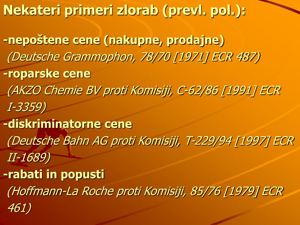 Nekateri primeri zlorab (prevl. pol.): -nepoštene cene (nakupne, prodajne) (Deutsche Grammophon, 78/70 [1971] ECR 487) -roparske cene (AKZO Chemie BV proti Komisiji, C-62/86 [1991] ECR I-3359) -diskriminatorne cene (Deutsche Bahn AG proti Komisiji, T-229/94 [1997] ECR II-1689) -rabati in popusti (Hoffmann-La Roche proti Komisiji, 85/76 [1979] ECR 461)