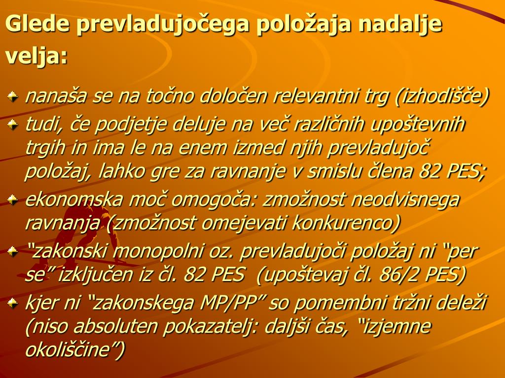 Glede prevladujočega položaja nadalje velja: • nanaša se na točno določen relevantni trg (izhodišče) • tudi, če podjetje deluje na več različnih upoštevnih trgih in ima le na enem izmed njih prevladujoč položaj, lahko gre za ravnanje v smislu člena 82 PES; • ekonomska moč omogoča: zmožnost neodvisnega ravnanja (zmožnost omejevati konkurenco) • “zakonski monopolni oz. prevladujoči položaj ni “per se” izključen iz čl. 82 PES (upoštevaj čl. 86/2 PES) • kjer ni “zakonskega MP/PP” so pomembni tržni deleži (niso absoluten pokazatelj: daljši čas, “izjemne okoliščine”)