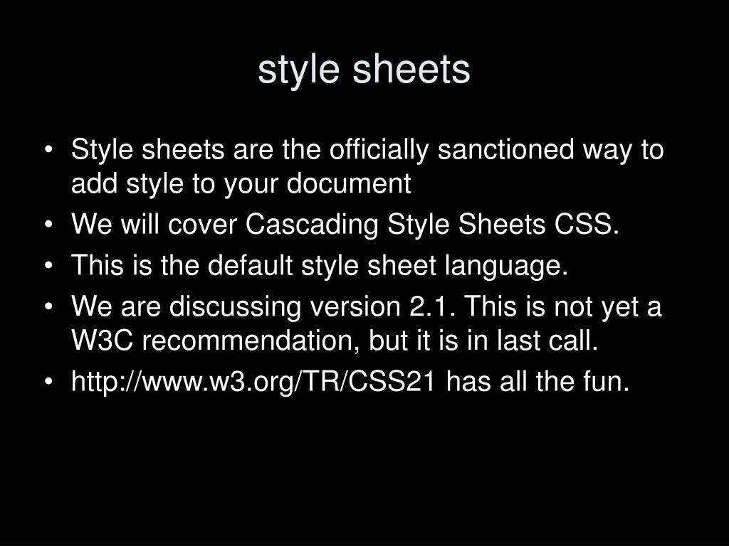 style sheets • Style sheets are the officially sanctioned way to add style to your document • We will cover Cascading Style Sheets CSS. • This is the default style sheet language. • We are discussing version 2.1. This is not yet a W3C recommendation, but it is in last call. • http://www.w3.org/TR/CSS21 has all the fun.