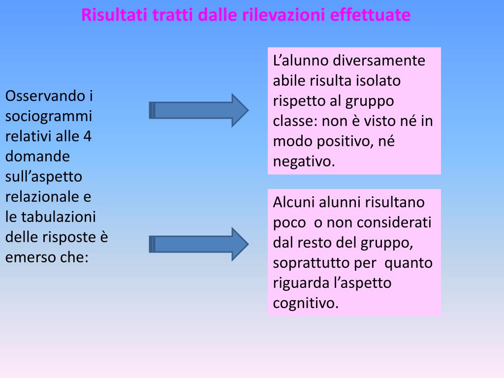 Risultati tratti dalle rilevazioni effettuate L’alunno diversamente abile risulta isolato rispetto al gruppo classe: non è visto né in modo positivo, né negativo. Osservando i sociogrammi relativi alle 4 domande sull’aspetto relazionale e le tabulazioni delle risposte è emerso che: Alcuni alunni risultano poco o non considerati dal resto del gruppo, soprattutto per quanto riguarda l’aspetto cognitivo.