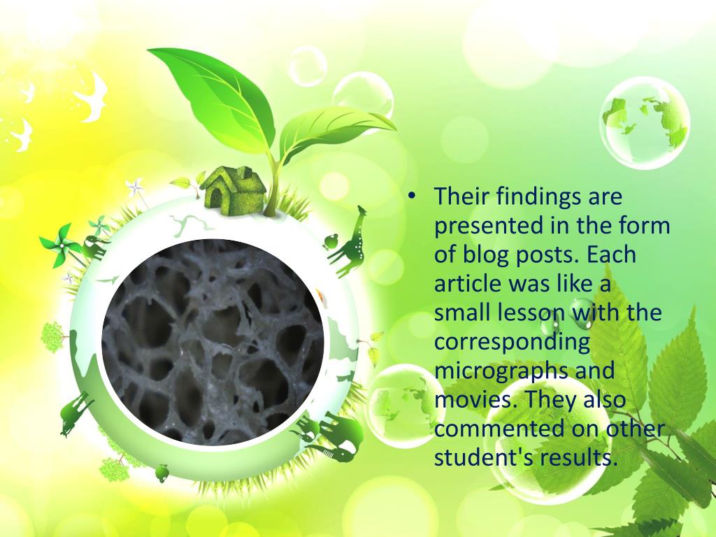 Their findings are presented in the form of blog posts. Each article was like a small lesson with the corresponding micrographs and movies. They also commented on other student's results.