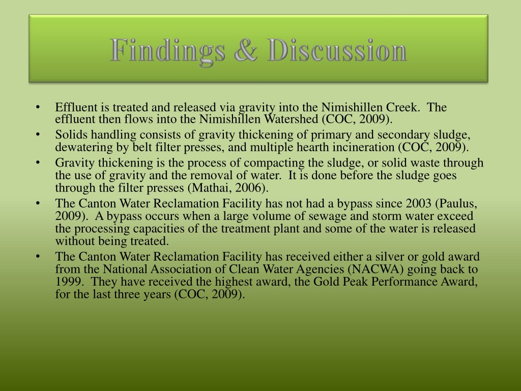 Effluent is treated and released via gravity into the Nimishillen Creek. The effluent then flows into the Nimishillen Watershed (COC, 2009). • Solids handling consists of gravity thickening of primary and secondary sludge, dewatering by belt filter presses, and multiple hearth incineration (COC, 2009). • Gravity thickening is the process of compacting the sludge, or solid waste through the use of gravity and the removal of water. It is done before the sludge goes through the filter presses (Mathai, 2006). • The Canton Water Reclamation Facility has not had a bypass since 2003 (Paulus, 2009). A bypass occurs when a large volume of sewage and storm water exceed the processing capacities of the treatment plant and some of the water is released without being treated. • The Canton Water Reclamation Facility has received either a silver or gold award from the National Association of Clean Water Agencies (NACWA) going back to 1999. They have received the highest award, the Gold Peak Performance Award, for the last three years (COC, 2009).