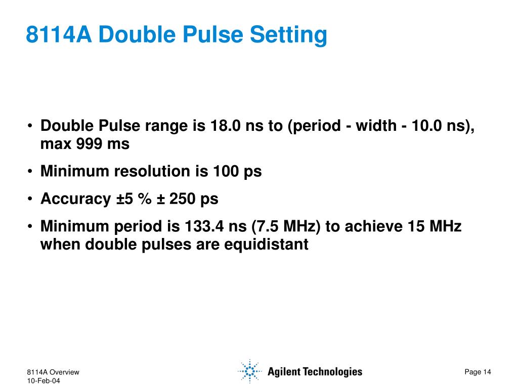 8114A Double Pulse Setting • Double Pulse range is 18.0 ns to (period - width - 10.0 ns), max 999 ms • Minimum resolution is 100 ps • Accuracy ±5 % ± 250 ps • Minimum period is 133.4 ns (7.5 MHz) to achieve 15 MHz when double pulses are equidistant