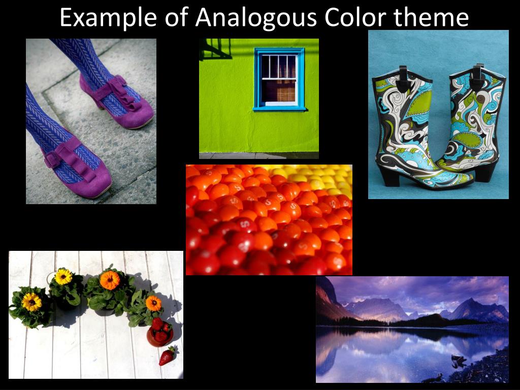 Analogous Colors Analogous (similar) colors are any three colors which are side by side on a 12 part color wheel, such as yellow-green, yellow, and yellow-orange. Usually one of the three colors predominates.