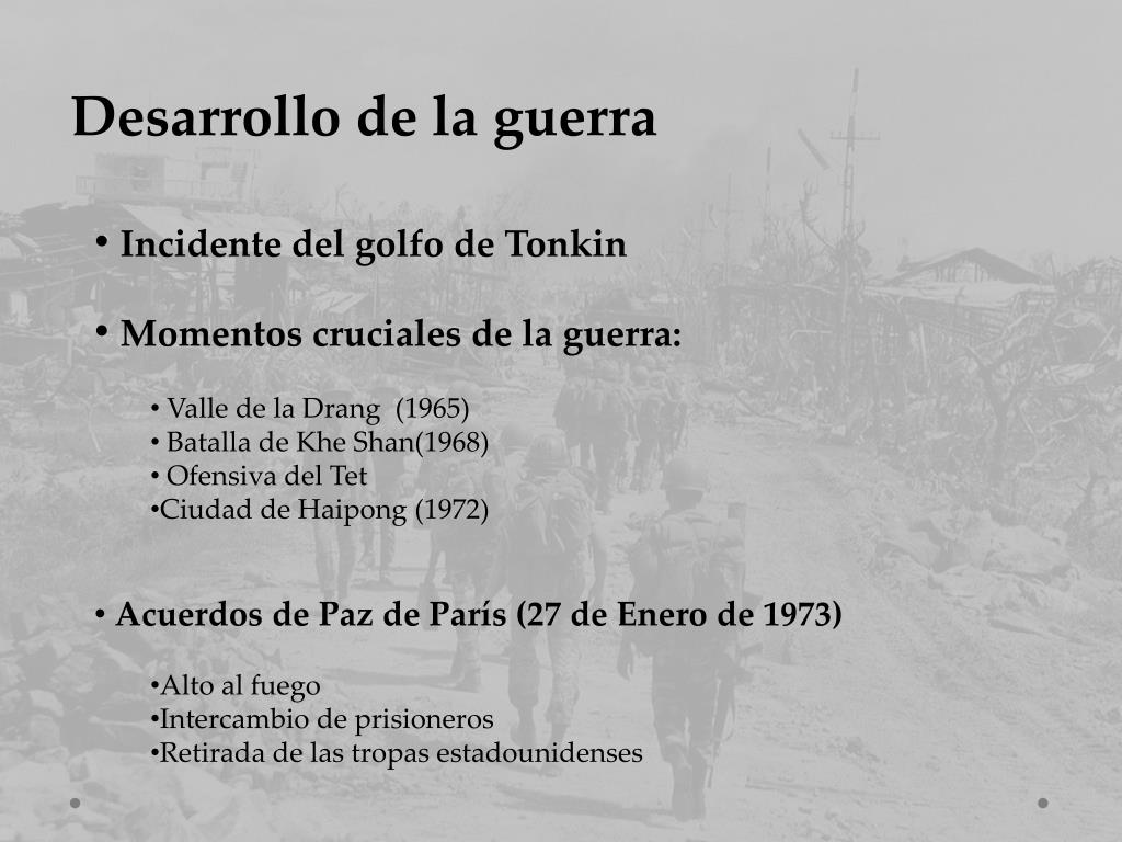 Desarrollo de la guerra • Incidente del golfo de Tonkin • Momentos cruciales de la guerra: • Valle de la Drang (1965) • Batalla de Khe Shan(1968) • Ofensiva del Tet • Ciudad de Haipong (1972) • Acuerdos de Paz de París (27 de Enero de 1973) • Alto al fuego • Intercambio de prisioneros • Retirada de las tropas estadounidenses