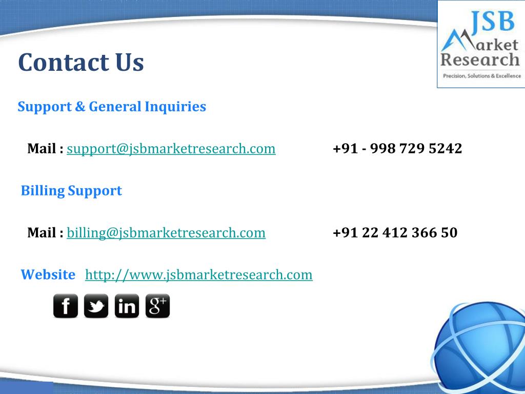 Contact Us Support & General Inquiries Mail :support@jsbmarketresearch.com+91 - 998 729 5242 Billing Support Mail :billing@jsbmarketresearch.com+91 22 412 366 50 Websitehttp://www.jsbmarketresearch.com