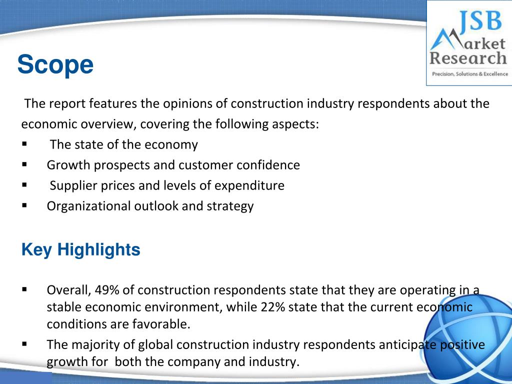 Reasons to buy • This report is the result of an extensive survey drawn from Timetric’s exclusive panel of leading construction industry executives. • The report analyzes current economic conditions prevailing around the world. and their impact on the construction industry. • The report forecasts company and industry growth prospects. • The report provides information on the impact consumer confidence, supplier prices, and staff headcount are likely to have on the investment decisions of industry executives. Check Full Report on http://www.jsbmarketresearch.com/construction/r-Construction Business-Confidence-Report-119414