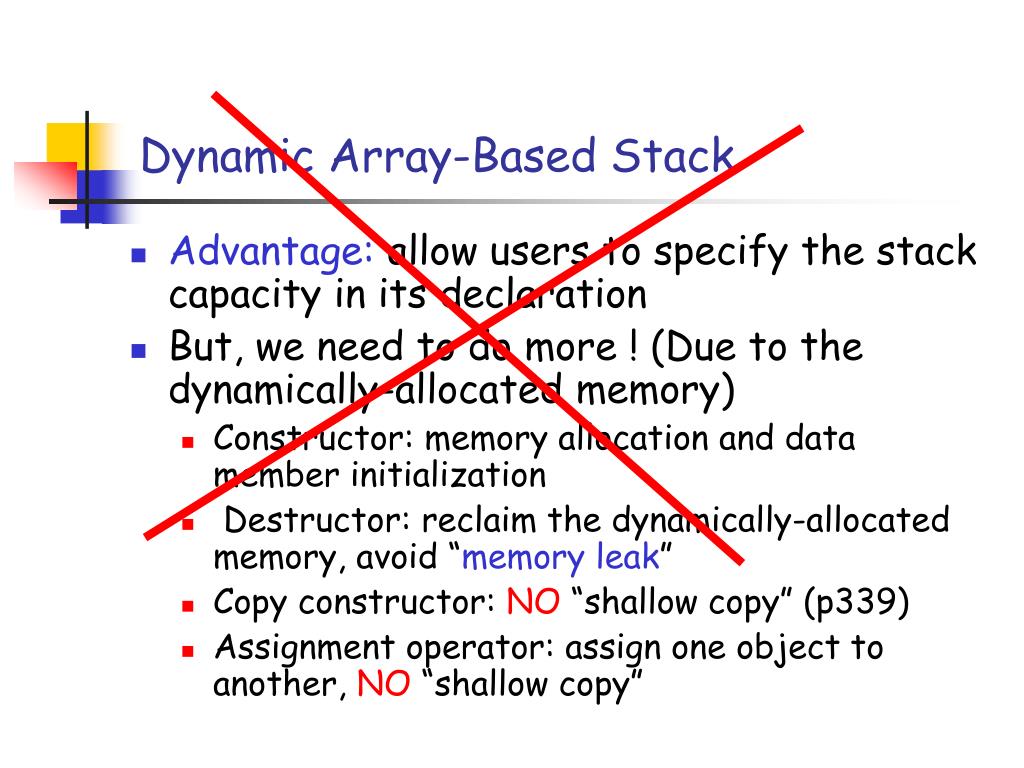 Dynamic Array-Based Stack • Advantage: allow users to specify the stack capacity in its declaration • But, we need to do more ! (Due to the dynamically-allocated memory) • Constructor: memory allocation and data member initialization • Destructor: reclaim the dynamically-allocated memory, avoid “memory leak” • Copy constructor: NO “shallow copy” (p339) • Assignment operator: assign one object to another, NO “shallow copy”