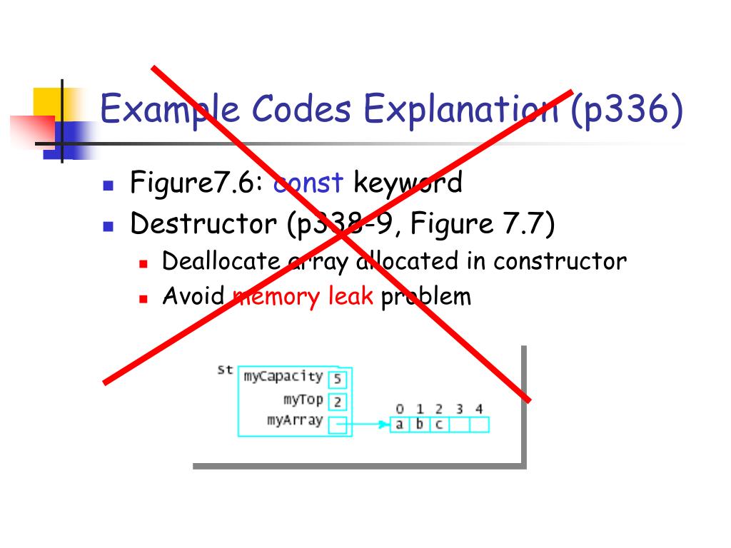 Example Codes Explanation (p336) • Figure7.6: const keyword • Destructor (p338-9, Figure 7.7) • Deallocate array allocated in constructor • Avoid memory leak problem