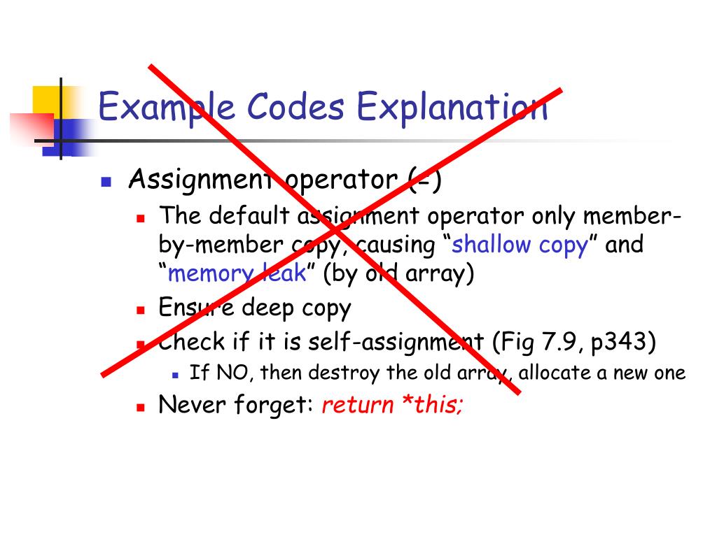 Example Codes Explanation • Assignment operator (=) • The default assignment operator only member-by-member copy, causing “shallow copy” and “memory leak” (by old array) • Ensure deep copy • Check if it is self-assignment (Fig 7.9, p343) • If NO, then destroy the old array, allocate a new one • Never forget: return *this;
