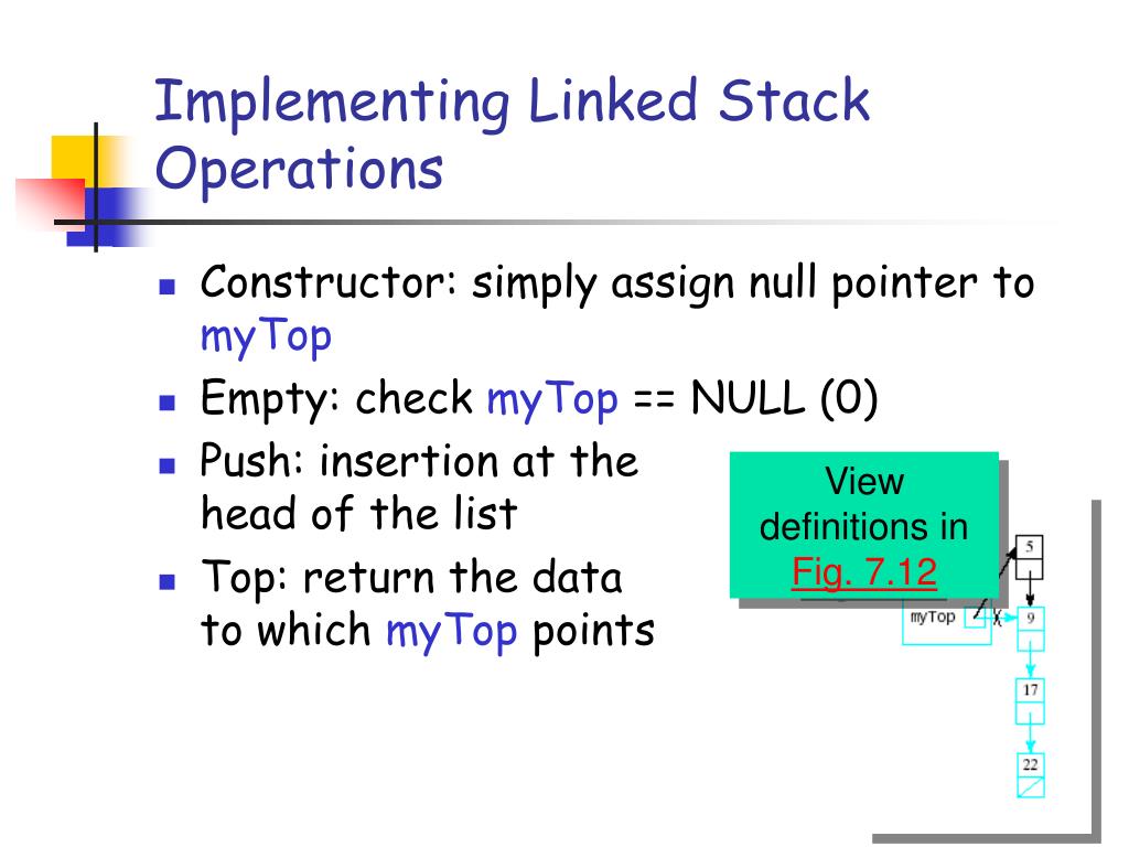 Implementing Linked Stack Operations • Constructor: simply assign null pointer to myTop • Empty: check myTop == NULL (0) • Push: insertion at the head of the list • Top: return the data to which myTop points View definitions in Fig. 7.12