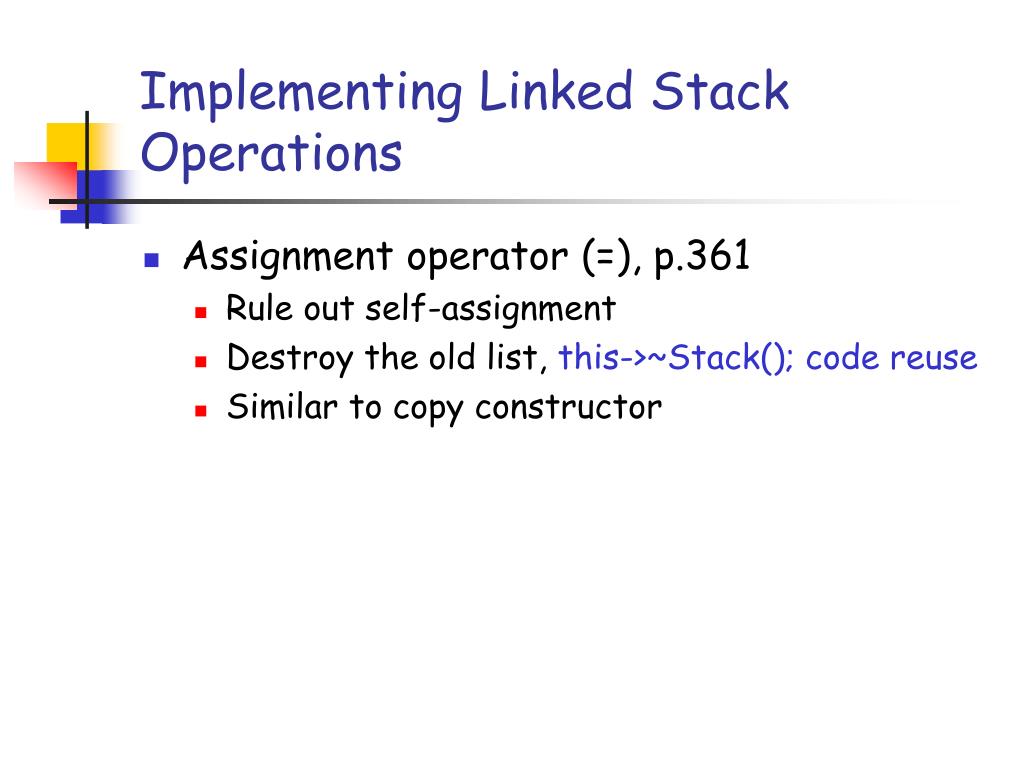 Implementing Linked Stack Operations • Assignment operator (=), p.361 • Rule out self-assignment • Destroy the old list, this->~Stack(); code reuse • Similar to copy constructor