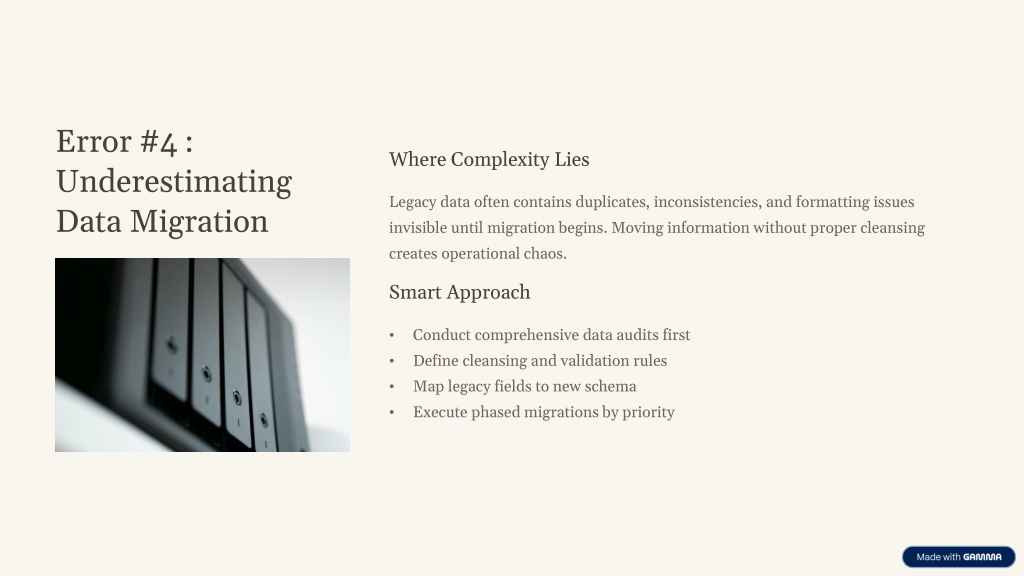 Error #4: Underestimating Data Migration Where Complexity Lies Legacy data often contains duplicates, inconsistencies, and formatting issues invisible until migration begins. Moving information without proper cleansing creates operational chaos. Smart Approach • Conduct comprehensive data audits first • Define cleansing and validation rules • Map legacy fields to new schema • Execute phased migrations by priority