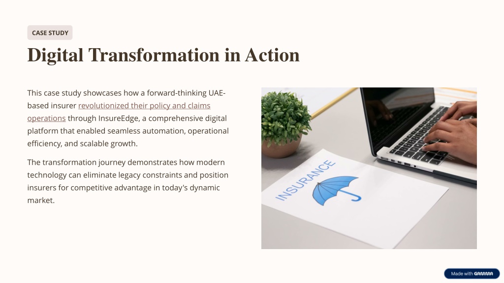 CASE STUDY Digital Transformation in Action This case study showcases how a forward-thinking UAE-based insurer revolutionized their policy and claims operations through InsureEdge, a comprehensive digital platform that enabled seamless automation, operational efficiency, and scalable growth. The transformation journey demonstrates how modern technology can eliminate legacy constraints and position insurers for competitive advantage in today's dynamic market.