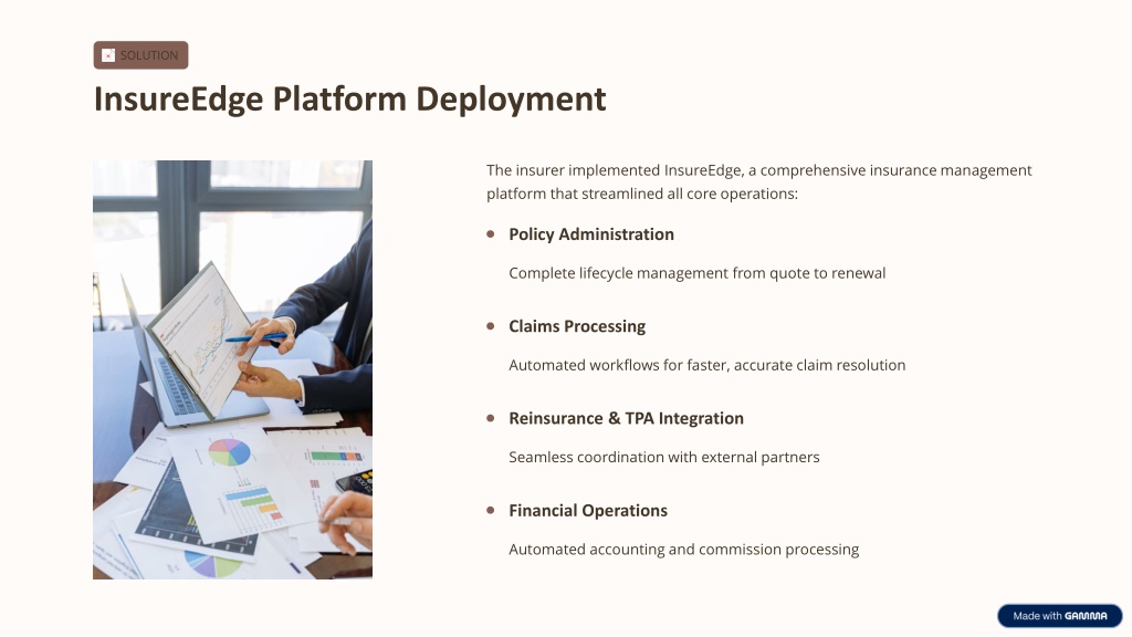 SOLUTION InsureEdge Platform Deployment The insurer implemented InsureEdge, a comprehensive insurance management platform that streamlined all core operations: Policy Administration Complete lifecycle management from quote to renewal Claims Processing Automated workflows for faster, accurate claim resolution Reinsurance & TPA Integration Seamless coordination with external partners Financial Operations Automated accounting and commission processing