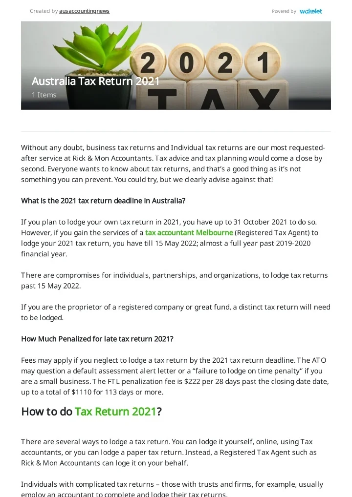 Powered by Created by ausaccountingnews Australia Tax Return 2021 1 Items Without any doubt, business tax returns and Individual tax returns are our most requested- after service at Rick & Mon Accountants. Tax advice and tax planning would come a close by second. Everyone wants to know about tax returns, and that’s a good thing as it’s not something you can prevent. You could try, but we clearly advise against that! What is the 2021 tax return deadline in Australia? If you plan to lodge your own tax return in 2021, you have up to 31 October 2021 to do so. However, if you gain the services of a tax accountant Melbourne (Registered Tax Agent) to lodge your 2021 tax return, you have till 15 May 2022; almost a full year past 2019-2020 financial year. There are compromises for individuals, partnerships, and organizations, to lodge tax returns past 15 May 2022. If you are the proprietor of a registered company or great fund, a distinct tax return will need to be lodged. How Much Penalized for late tax return 2021? Fees may apply if you neglect to lodge a tax return by the 2021 tax return deadline. The ATO may question a default assessment alert letter or a “failure to lodge on time penalty” if you are a small business. The FTL penalization fee is $222 per 28 days past the closing date date, up to a total of $1110 for 113 days or more. How to do Tax Return 2021? There are several ways to lodge a tax return. You can lodge it yourself, online, using Tax accountants, or you can lodge a paper tax return. Instead, a Registered Tax Agent such as Rick & Mon Accountants can loge it on your behalf. Individuals with complicated tax returns – those with trusts and firms, for example, usually employ an accountant to complete andlodge their tax returns.