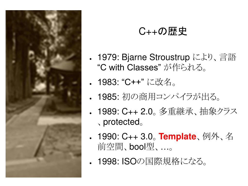 C++の歴史 • 1979: Bjarne Stroustrup により、言語 “C with Classes” が作られる。 • 1983: “C++” に改名。 • 1985: 初の商用コンパイラが出る。 • 1989: C++ 2.0。多重継承、抽象クラス、protected。 • 1990: C++ 3.0。Template、例外、名前空間、bool型、…。 • 1998: ISOの国際規格になる。
