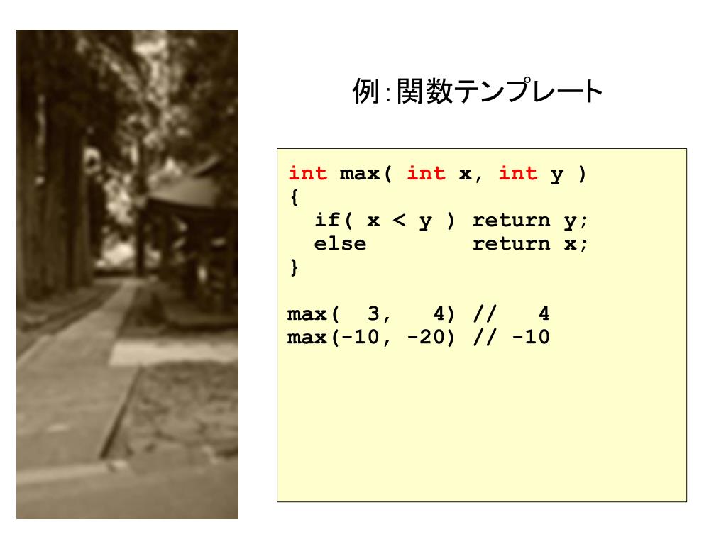 例:関数テンプレート int max( int x, int y ) { if( x < y ) return y; else return x; } max( 3, 4) // 4 max(-10, -20) // -10