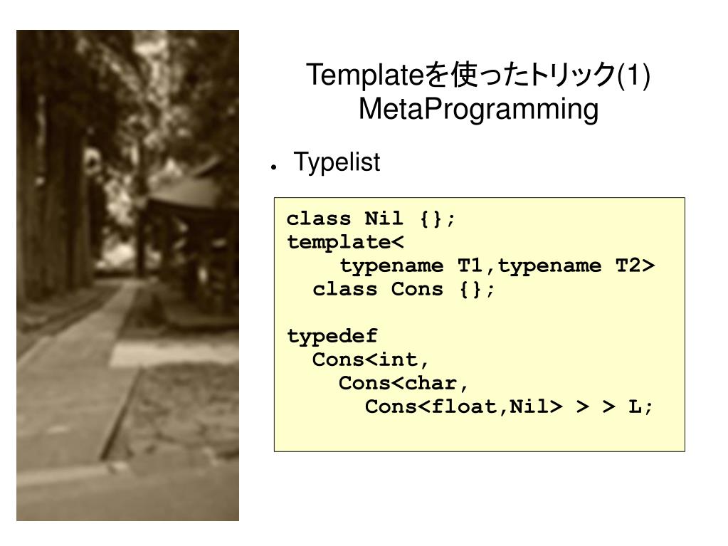 Templateを使ったトリック(1)MetaProgramming • Typelist class Nil {}; template< typename T1,typename T2> class Cons {}; typedef Cons<int, Cons<char, Cons<float,Nil> > > L;