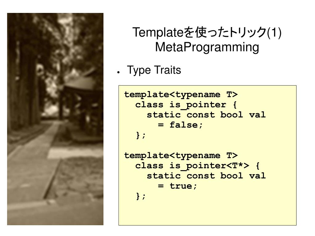 Templateを使ったトリック(1)MetaProgramming • Type Traits template<typename T> class is_pointer { static const bool val = false; }; template<typename T> class is_pointer<T*> { static const bool val = true; };